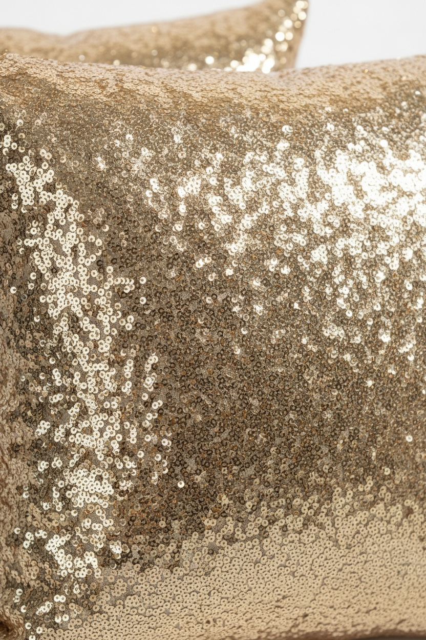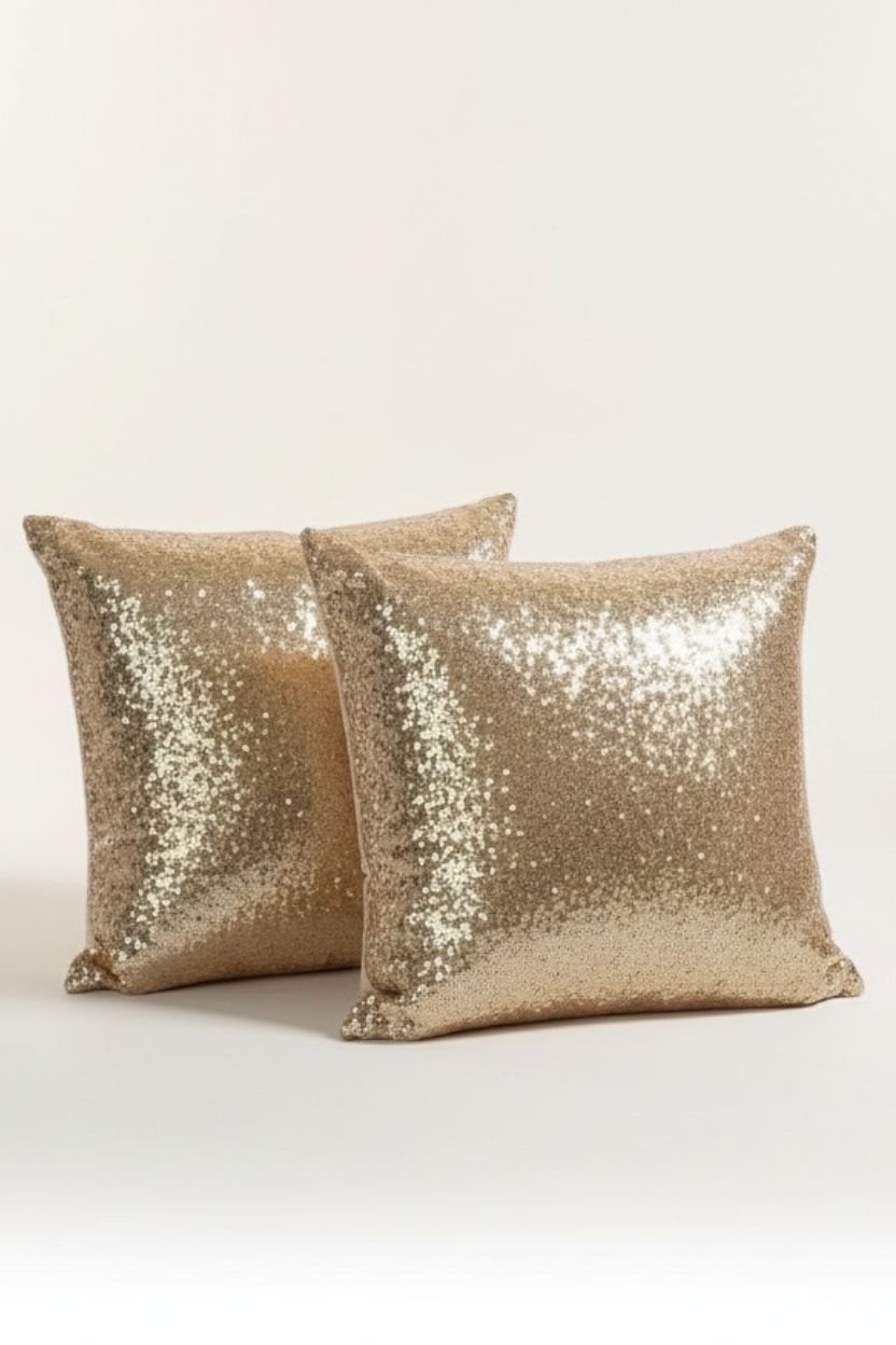 "Deja" light gold pillows. Designed with light gold sequins on the front & satin on the back. Pair these pillows with another pillow set to complete your perfect lounge look.