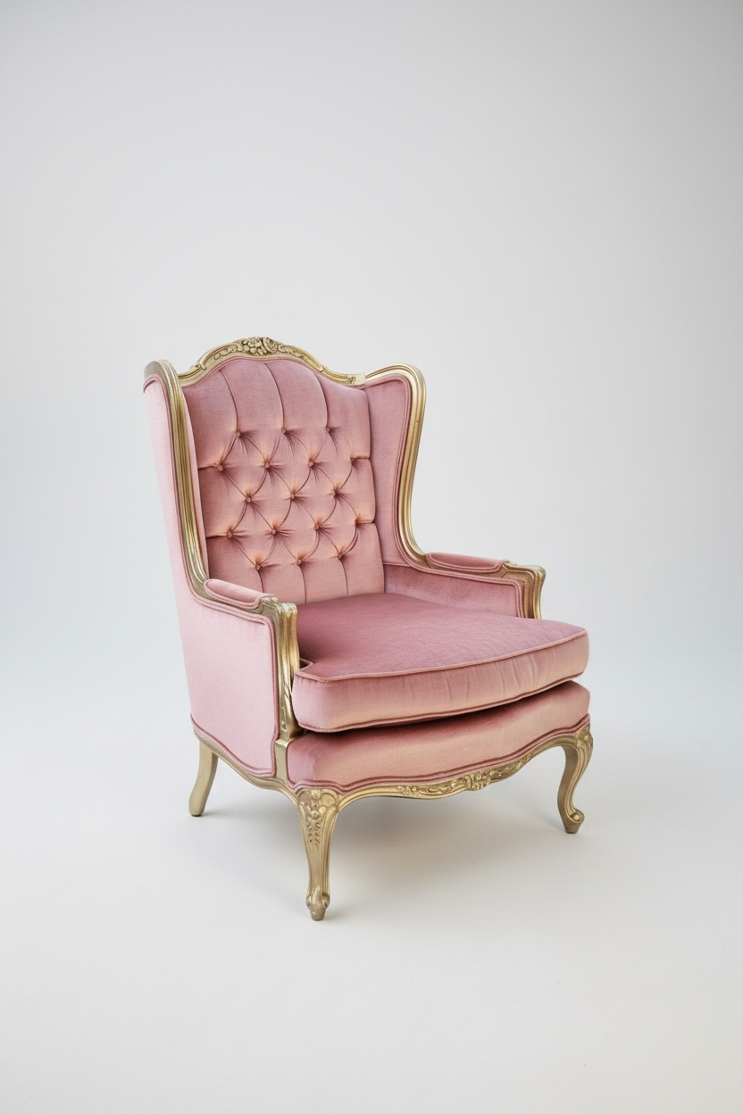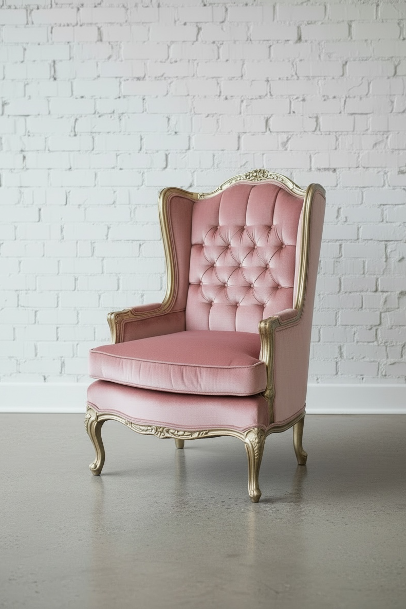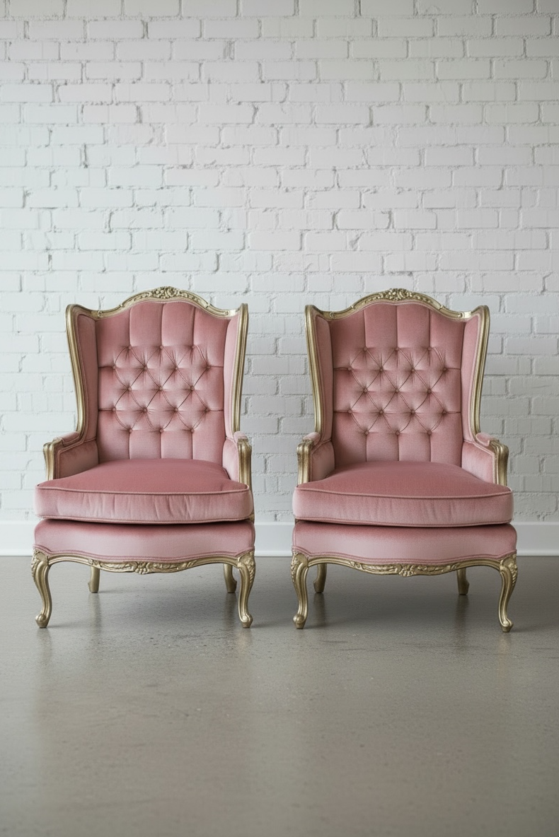 “Pretty in Pink” chairs. The pink color and gold frame make these vintage chairs simply fabulous. Charming rose carved details and lovely tufts on each of both of these pink vintage chairs. Two piece collection. Dreamy side chairs for a lounge area at a wedding, bridal shower, etc.